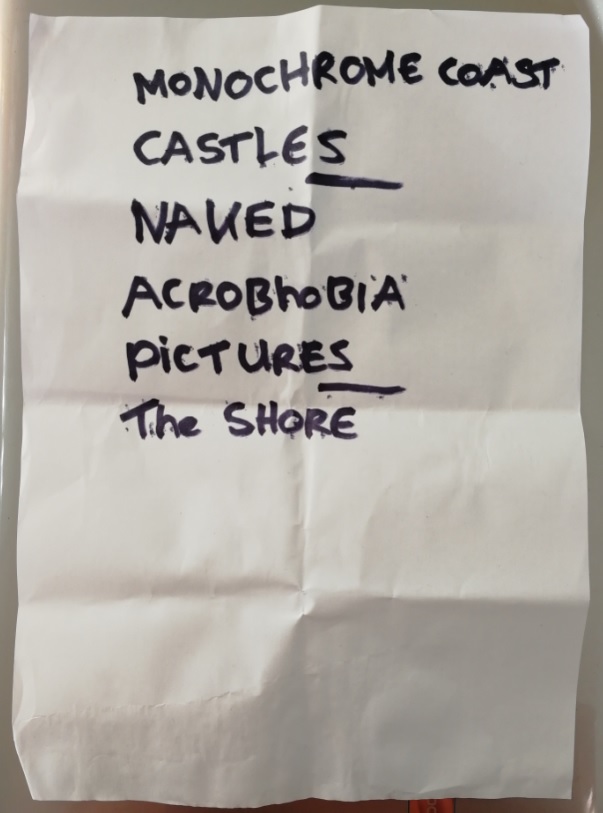 ‘Monochrome Coast’, ‘Castles’, ‘Naked’, ‘Acrophobia’, ‘Pictures’, ‘The Shore’.