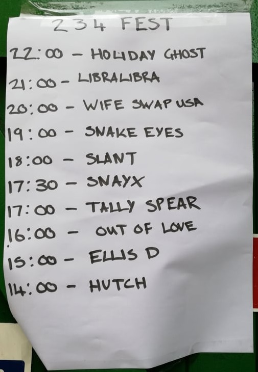 The final of the 20 acts of this year’s ‘234 Fest’ were Holiday Ghosts who took to the stage bang on 10pm. They operate a slightly unusual vocals and drums, plus two guitars and bass format. These guys were definitely intent on ensuring that the climax of the ‘234 Fest’ would go out on a high with their swinging, shuffling rockabilly style drum tapping surf beats.