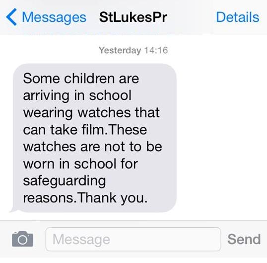 It read: “Some children are arriving in school wearing watches that can take film. These watches are not to be worn for safeguarding reasons. Thank you.”