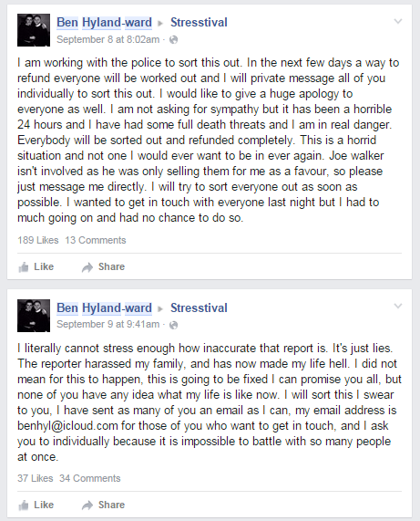 In response to a public Facebook group called Stresstival, Ben Hyland-Ward left a post on Tuesday morning (8 September).