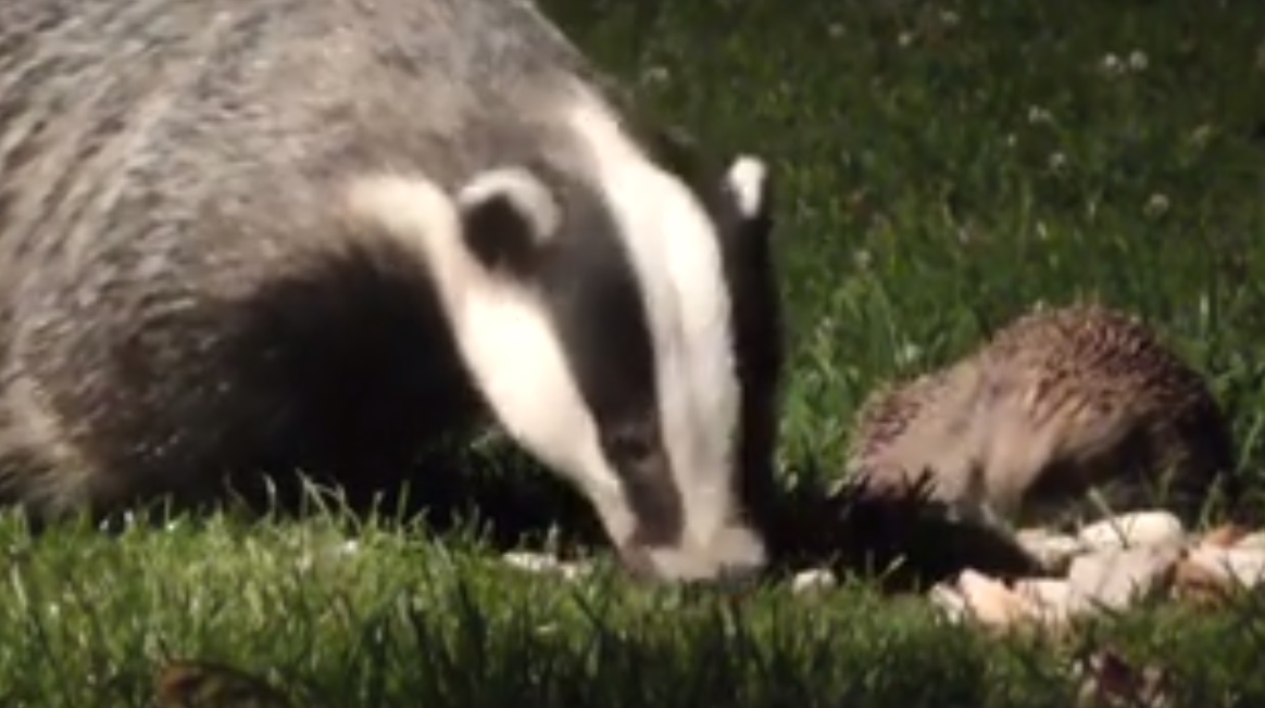 You can hear him saying: “Well that’s amazing, a badger and a hedgehog feeding side by side. It’s certainly a first for me.
