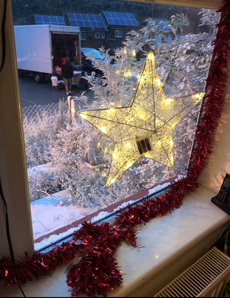 “We took the dogs out for a walk and came back to all this snow. Our whole house was covered in fake snow, all the trees and the whole ground were covered.
