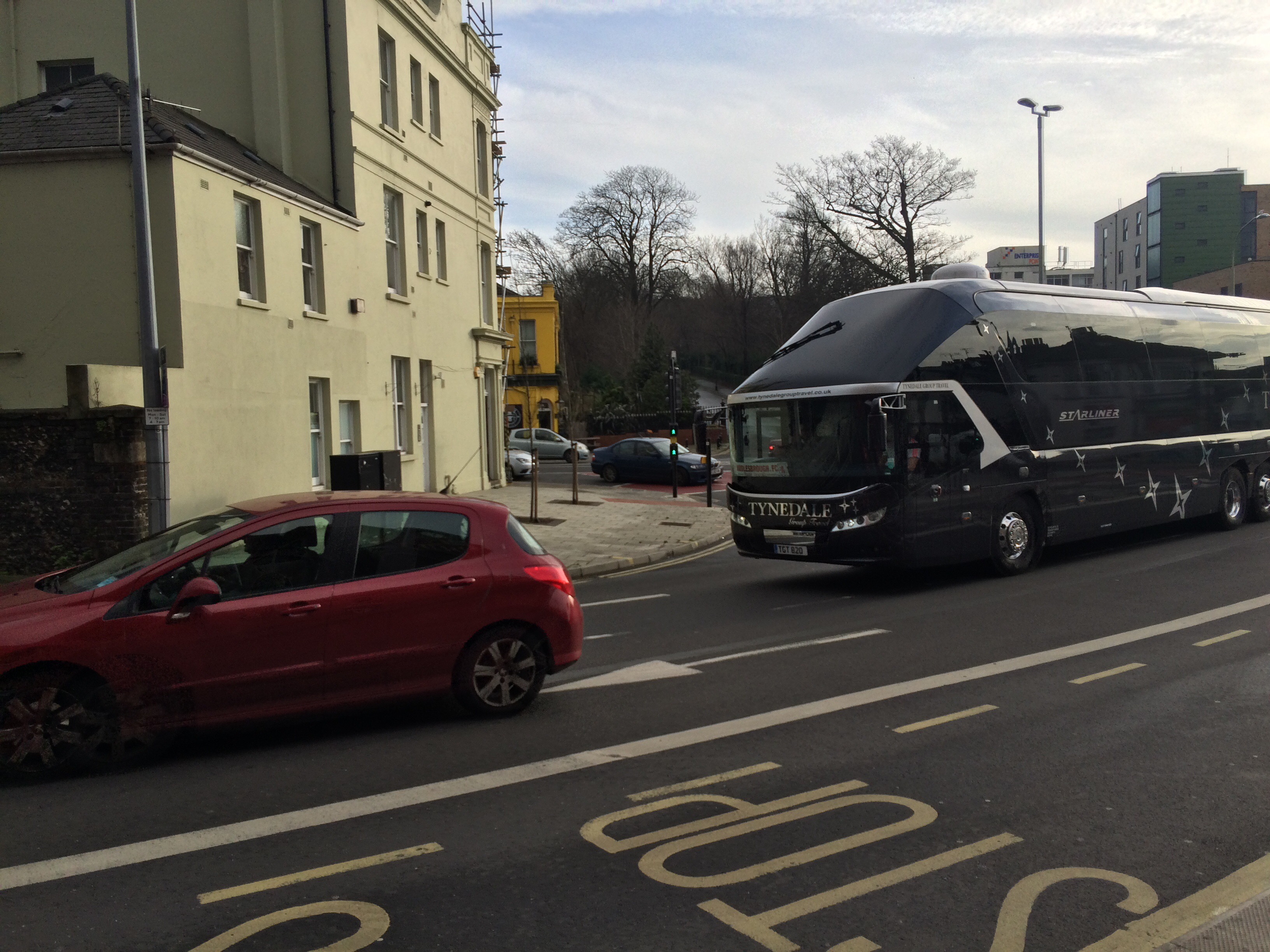 2) Boro turning up late ? They were spotted, trying to sneak almost unoticed along Lewes Road at around 11am. Here they are trying to negotiate the gyratory and obviously wondering if that cycle is for real.