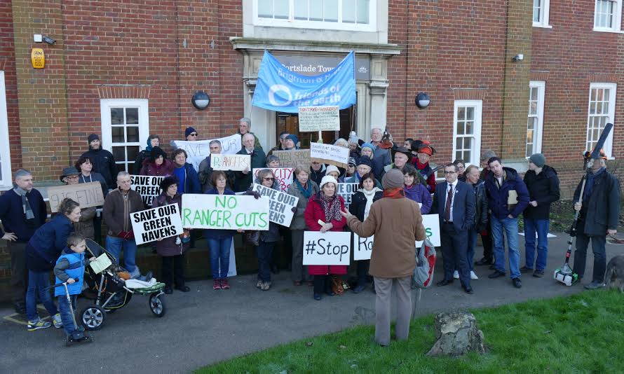 More than 60 rangers volunteers from 13 voluntary groups held a protest outside Portslade Town Hall before a meeting of a council committee.