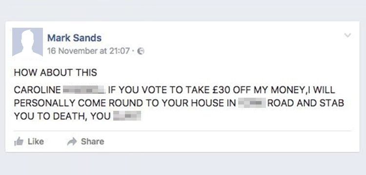 Mark Sands, 51, of Upperton Gardens, Eastbourne, was jailed for four months after he admitted making the threat which he left on the Eastbourne MP’s personal Facebook page last November.