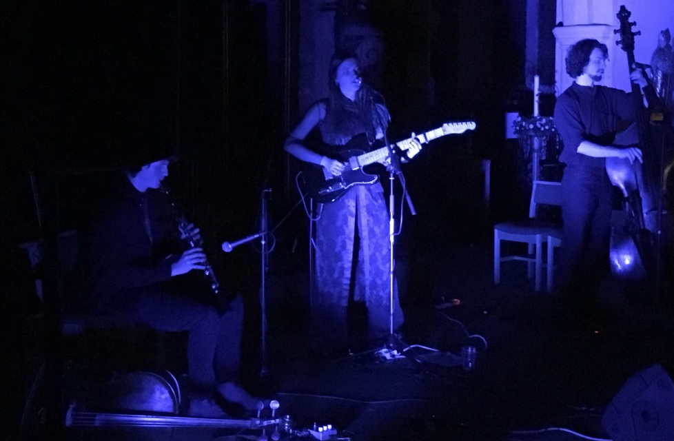 Next up were Brighton-based Night House who are fronted by the charismatic promoter of this fabulous night Nick Williams (Back in the Woods Promotions). This was a very eclectic set which mixed orchestral arrangements using a range of instruments, electronic beats and distinctive, powerful and sometimes falsetto vocals. Their style is an unusual fusion of electronica, indie and folk – but it works! Think Radiohead but more expansive and with much more going on.