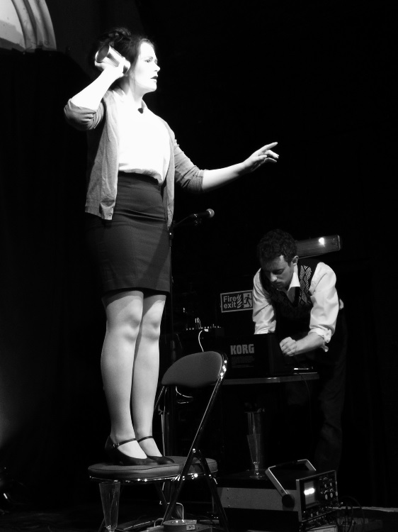 Then, boing, from behind the curtain stage left springs Jessie Coller, who is portraying the plays central character Delia Derbyshire. You immediately notice that Ms Coller has monotone face make-up on, as if to signify those good old black and white tv days. One also becomes immediately aware that the portrayal of Miss Derbyshire is awfully posh.