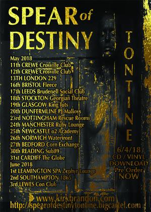 Spear Of Destiny were formed in 1983 after the demise of Kirk Brandon’s post punk iconic rockers Theatre Of Hate and today Kirk still records and produces music at a pleasing rate for his fans. For instance on April 6th this year Spear Of Destiny released their 14th studio album. It’s called ‘Tontine’ and I have a copy and it is very good indeed.
