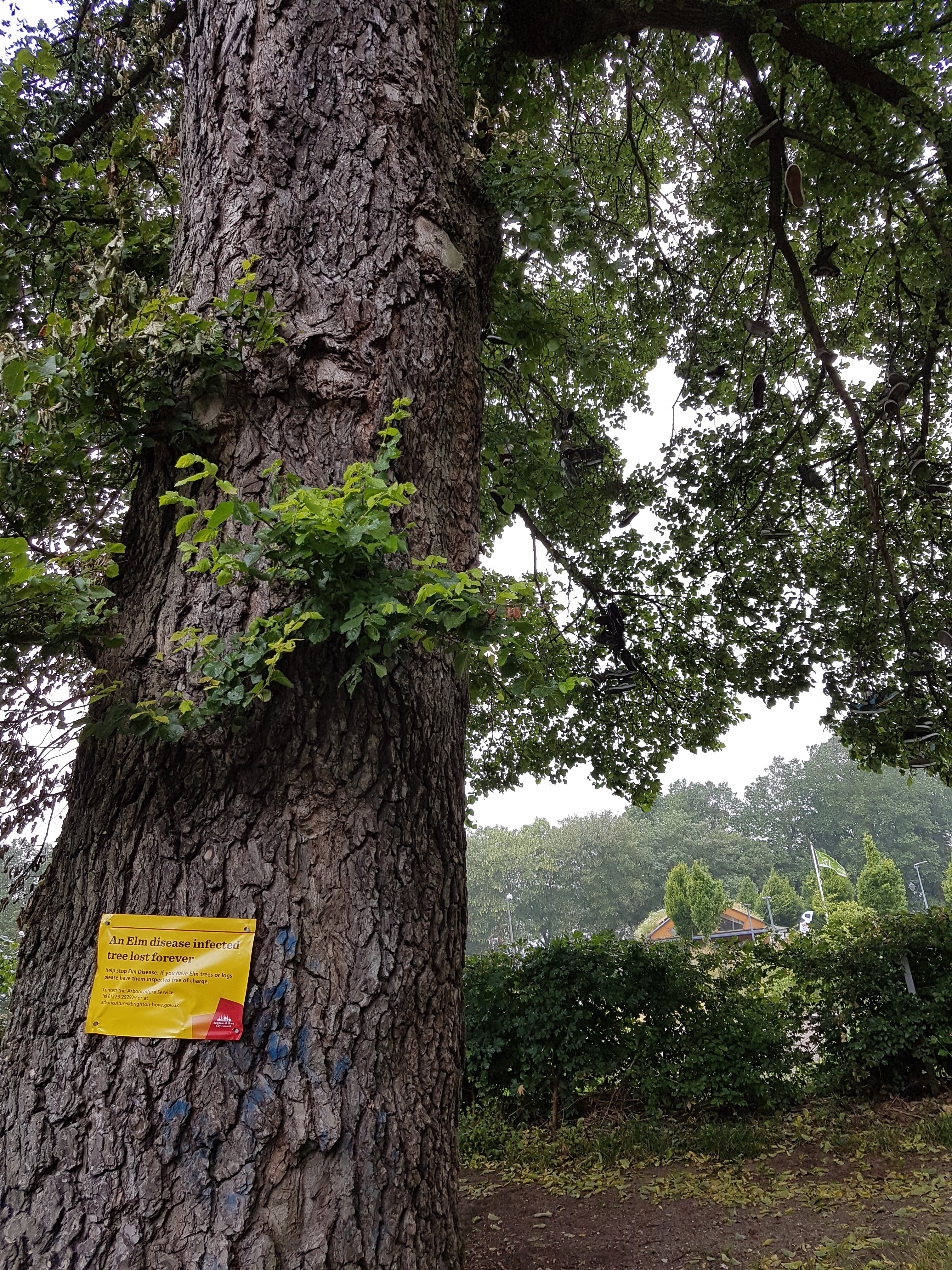 “As a silver lining, the two trees next to the shoe tree are not Elms so this should help by forming a natural barrier against the spread of Elm disease via the root systems of the infected Elm.”