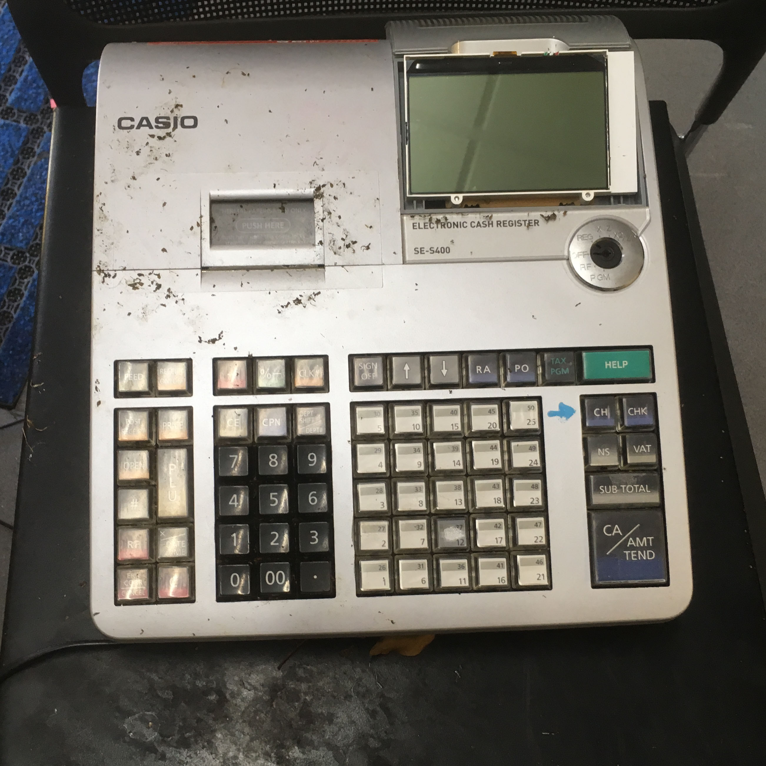 The Master Lock safe has been forced open. The electronic cash register is a Casio.