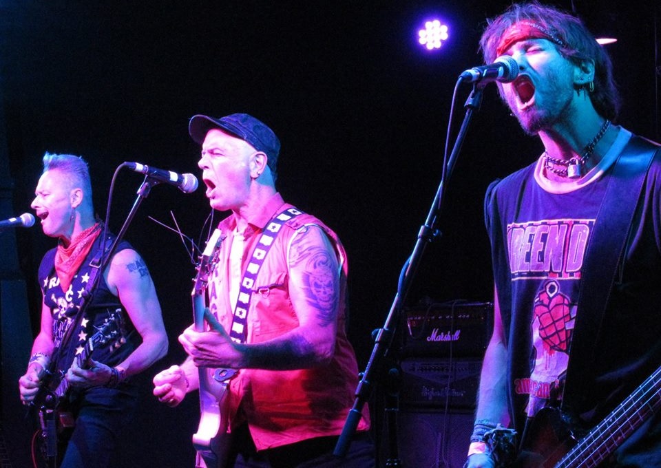 I was considering just staying upstairs to wait for Sham 69, but thought I’d nip down to check out the amusingly named Sp*nk Volcano & The Eruptions. I was glad I did, and I ended up staying for the whole set. They play a lively, entertaining and quite joyous comedy punk, with ear-worm tunes and very witty lyrics. You can’t miss Sp*nk Volcano (who also plays guitar in the band Dirt Box Disco). He wears a weird balaclava style mask covered in safety pins, and performs in a studded leather jacket and his underpants. This is visually quite alarming, but he exudes charm and is a naturally comic raconteur between songs. The band were really giving it some too, and those who stayed downstairs got a real treat.