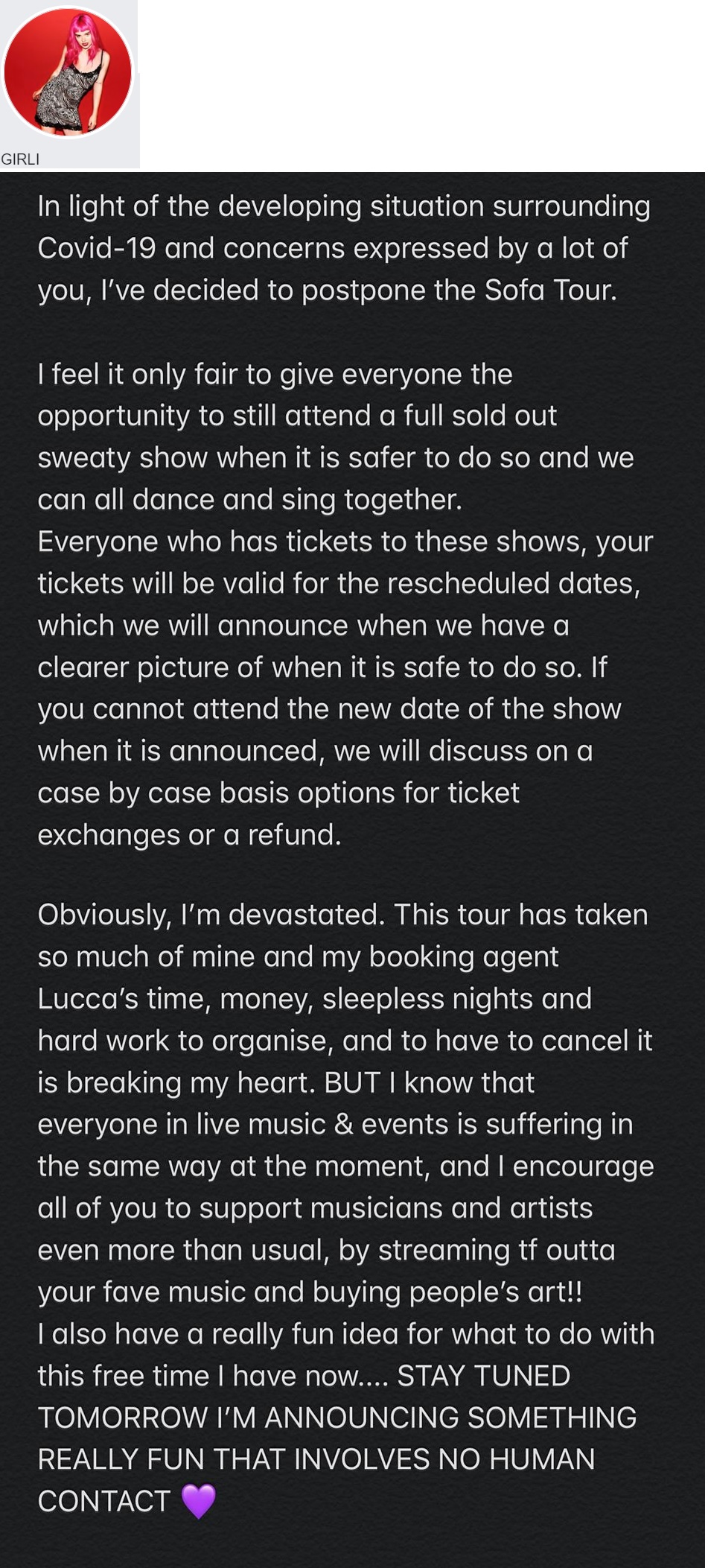 Many other concerts at other venues In Brighton are also at risk. Even the GIRLI’s intimate tour of Living Rooms has been postponed. See below:
