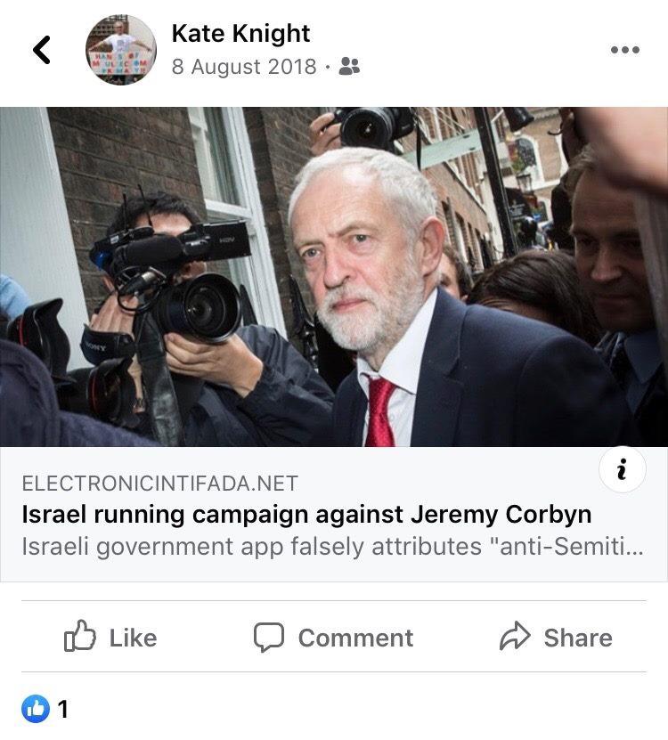 In August 2018 she posted a link to a story headlined “Israel running campaign against Jeremy Corbyn”.