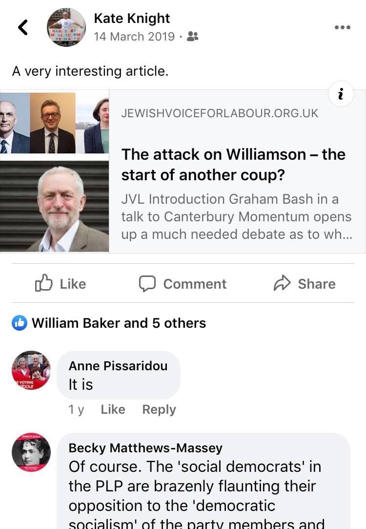 The posts that Councillor Knight has been reported for, which were posted from 2016 to March 2019, nearly all said that accusations of anti-semitism levelled at Jeremy Corbyn were a smear or manufactured by Israel.