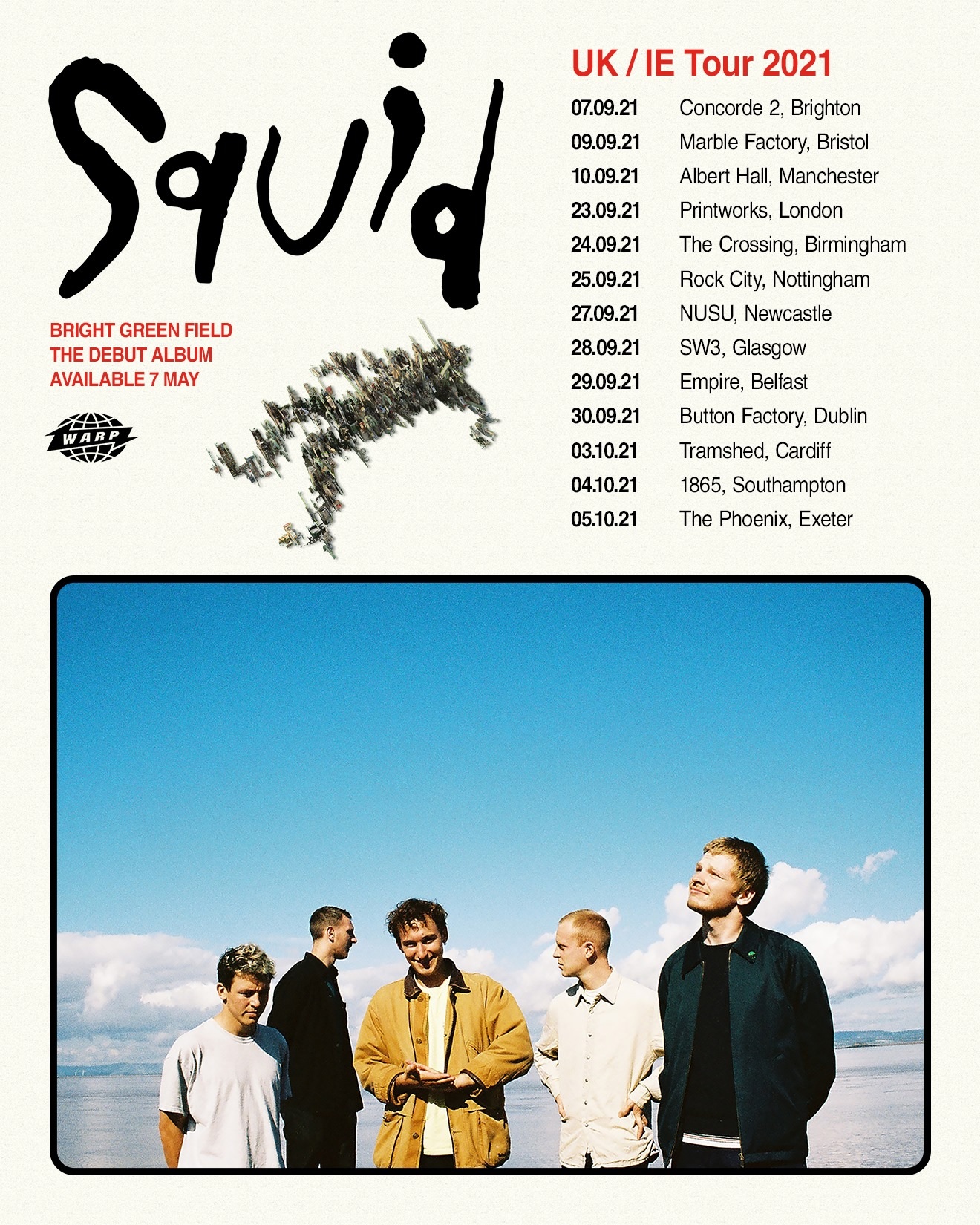 Some bands might be tempted to include previous singles on their debut – the band had released two more in 2020 via ‘Sludge’ and ‘Broadcaster’ – but instead ‘Bright Green Field’ is completely new. This sense of limitlessness and perpetual forward motion is one of the key ingredients that makes Squid so loved by fans and critics alike, from BBC Radio 6 Music, who have A-listed previous singles ‘Match Bet’, ‘The Cleaner’ and ‘Houseplants’, to publications such as The Guardian, NME, The Face, The Quietus and countless others. The band was also on the longlist for the BBC Music Sound Of 2020 Poll.