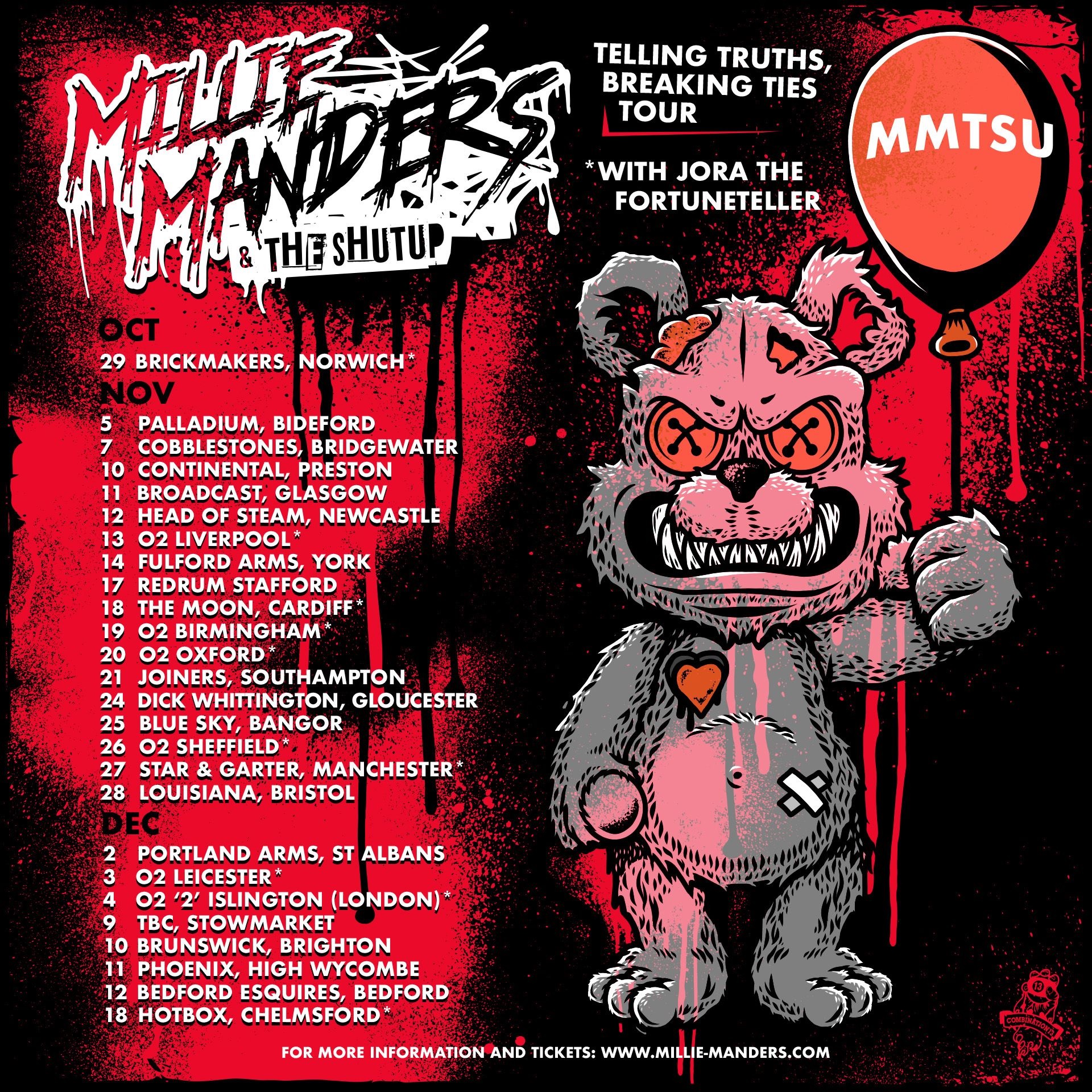 Millie Manders And The Shutup create cross-genre punk that is hard to ignore. With lyricism that pokes fun, draws you in or leaves you questioning social norms teamed with incredible vocal dexterity, grinding guitars, irresistible horn hooks and a pumping rhythm section, the Millie Manders Music Machine churns out more raw punk fusion than you can shake a stick at, with a huge amount of Pop appeal.