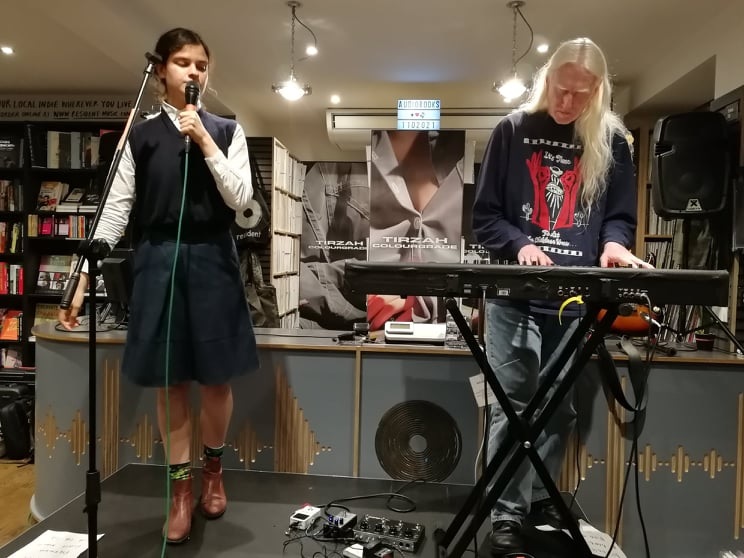 The duo appeared from the back of the shop at 6:33pm, which was shortly after the band’s musical choice playlist had been blurting out of the shop soundsystem. Of note on that front was the awesome ‘Moskow Diskow’ by Telex, which I hadn’t heard played anywhere else other than my gaff for decades! That certainly put me in the mood for the 23 minute audiobooks performance.