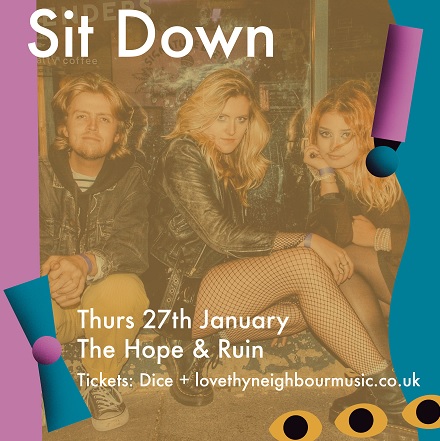 This Brighton based duo refer to themselves as “Apocalyptic art rock” and “hell’s house band”. They formed in 2016 after temporarily living in New York City, guitarist and vocalist Greg Burns and drummer and vocalist Katie Oldham honed their punk. Their live shows summon up fiery garage rock with infectious energy and acid-tongued wit. Sit Down forge their own brand of art rock that borders on doom, hip hop, and everything in between.