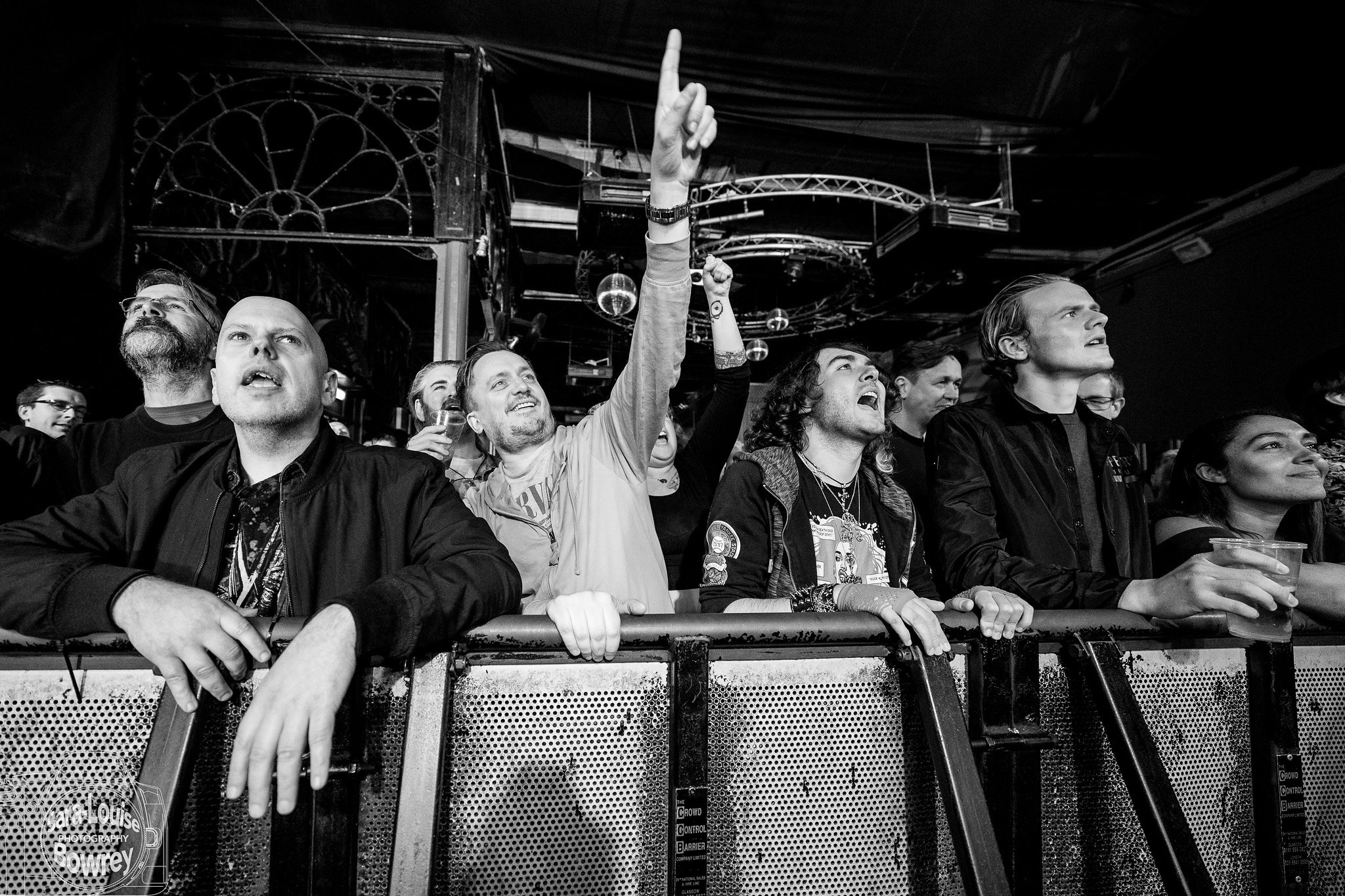 Recent single ‘Rust’ stands out, led by the shrill blast of a harmonica. There’s a funny moment between songs where the lights go up and Nick gets the whole audience to turn and face the back of the hall. They dutifully comply, and the singer mischievously points out the route to the merch table. It raises a chuckle, and is worth a few extra sales. ‘No Waters’ is another cracking number, with a bluesy vibe and a lot going on. Danny is playing synth bass like a theremin, varying the note by waving his right hand. He wears a ring with an LED light on, which is most likely enabling that move. Guitarist Adam is standing out on the bass bins, and Nick gets a long and rather complex vocal loop going, adding more and more parts. At the end he apologises for it going wrong, though it sounded pretty cool to me. Their final number is a rabble-rousing cover of ‘Immigrant Song’. It’s not an easy one to attempt, but they do it very well. Nick has jumped off stage into the photographers’ pit, and sings hanging over the crash barrier, leaning into the crowd. He unleashes a sustained scream worthy of Robert Plant himself, and keeps it going long enough to milk plenty of applause.