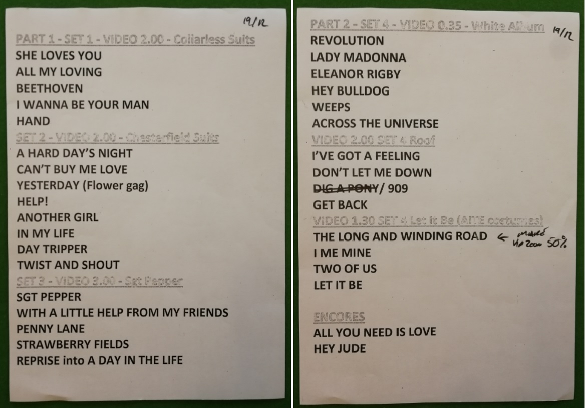In between each music section there is an amalgam of mainly black and white film cutups broadcast on the backdrop at the rear of the stage. The first of these was designed to get the punters in the right time frame and thus at 7:32pm, the music intro tape played images of the time which included snippets of other artist’s songs. For this first film it included Manfred Mann’s ‘5-4-3-2-1’ and The Crystals ‘Da Doo Ron Ron’. The very second this first film finished, the stage lights went up and there in front of us were the four guys playing their instruments. They were representing the Fab Four’s 1963–1964 era when Beatlemania conquered the world.