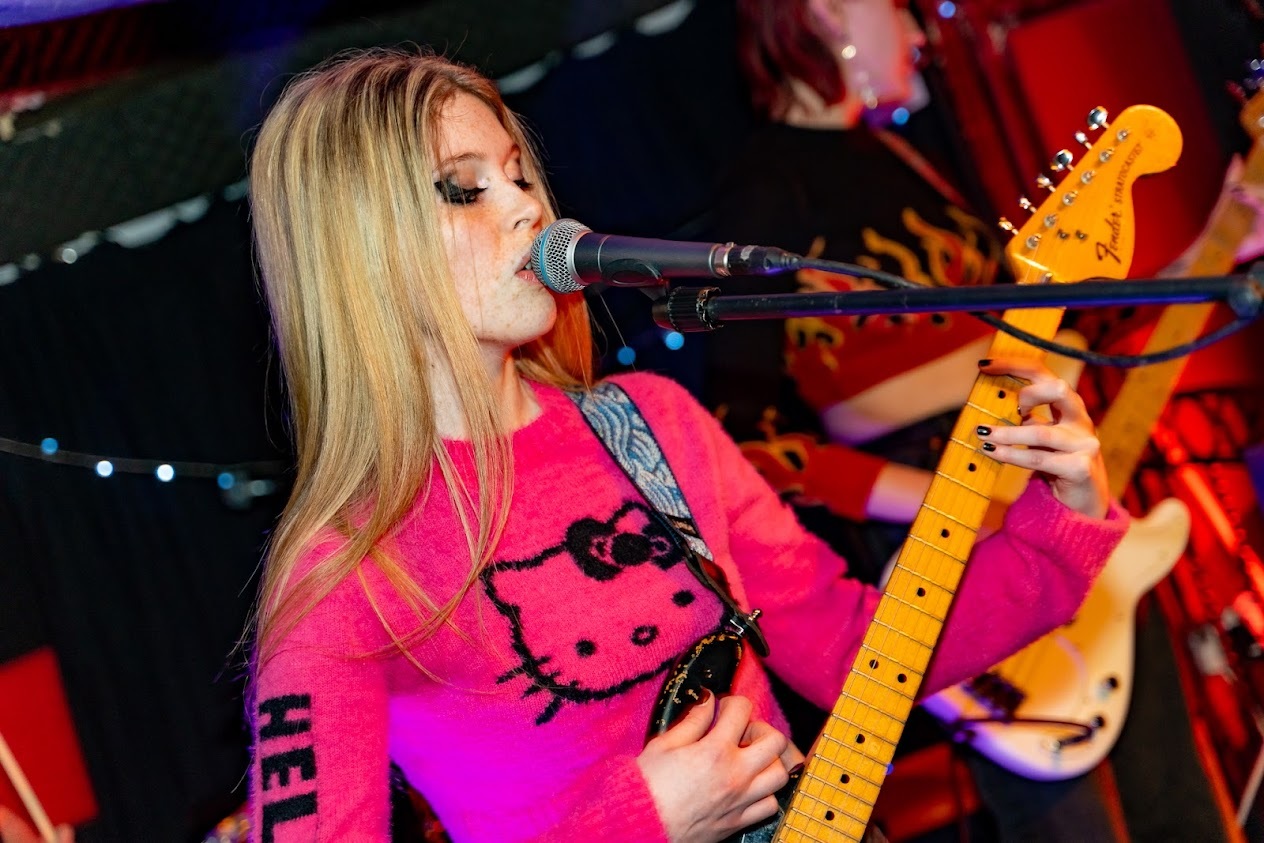 There are three bands on the bill, and shortly after 8pm, things kick off nicely with local alt-rock three-piece Warning Signal, comprising Eva Sheldrake on guitar and vocals, Evie Montague bass and Milo Hemsley on drums. It’s a big night for Eva as it is also her 18th birthday. Talk about pressure!