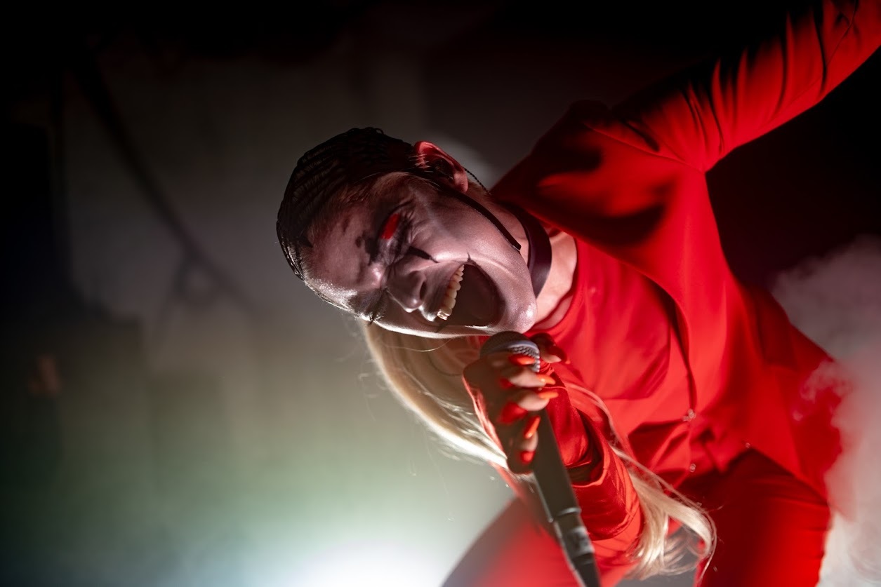 This is more like a trip to a dark theatre with both the drummer and bassist wearing hoodies with masks covering their spotlighted faces and SKYND herself eerily lit in waves of green and red lights a huge slit mouth on a painted face rising from the smoke”.