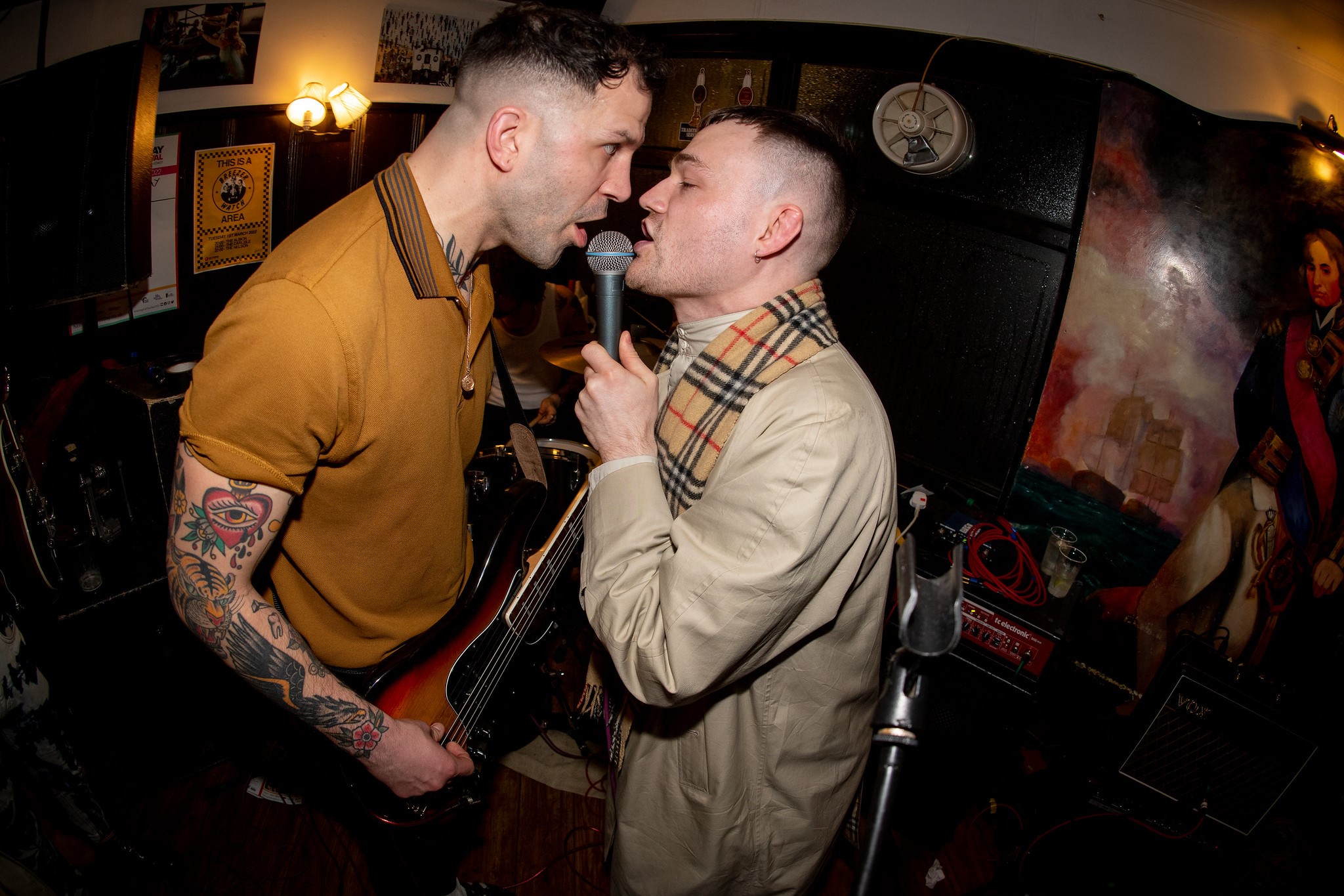 Murderers Are Optimists are a relatively new band on the Hastings scene, fronted by vocalist and guitarist Paul Sunshine and bassist Jo Gonzo. Tonight they have the services of an additional guitarist, and none other than Eddie Lewis, bass player for Kid Kapichi, depping on drums. Paul cuts a dapper figure in a Burberry check scarf and gabardine raincoat, which would be quite handy outside right now but must be rather warm as stage wear. By contrast, Jo is putting in a spectacularly animated and energetic performance, and is soon shirtless, revealing an extensive collection of tattoos. The music is a punky alt rock take on Britpop, big and powerful with massive hooks. I can see why they would be mates with Kid Kapichi. Eddie is a surprisingly fast and powerful drummer who is obviously experienced behind the kit. Paul’s geezerish vocals exude a disdain for authority and ooze attitude, whilst Jo is an absolute force of nature. I’m seriously impressed and will be looking out for this band in future.