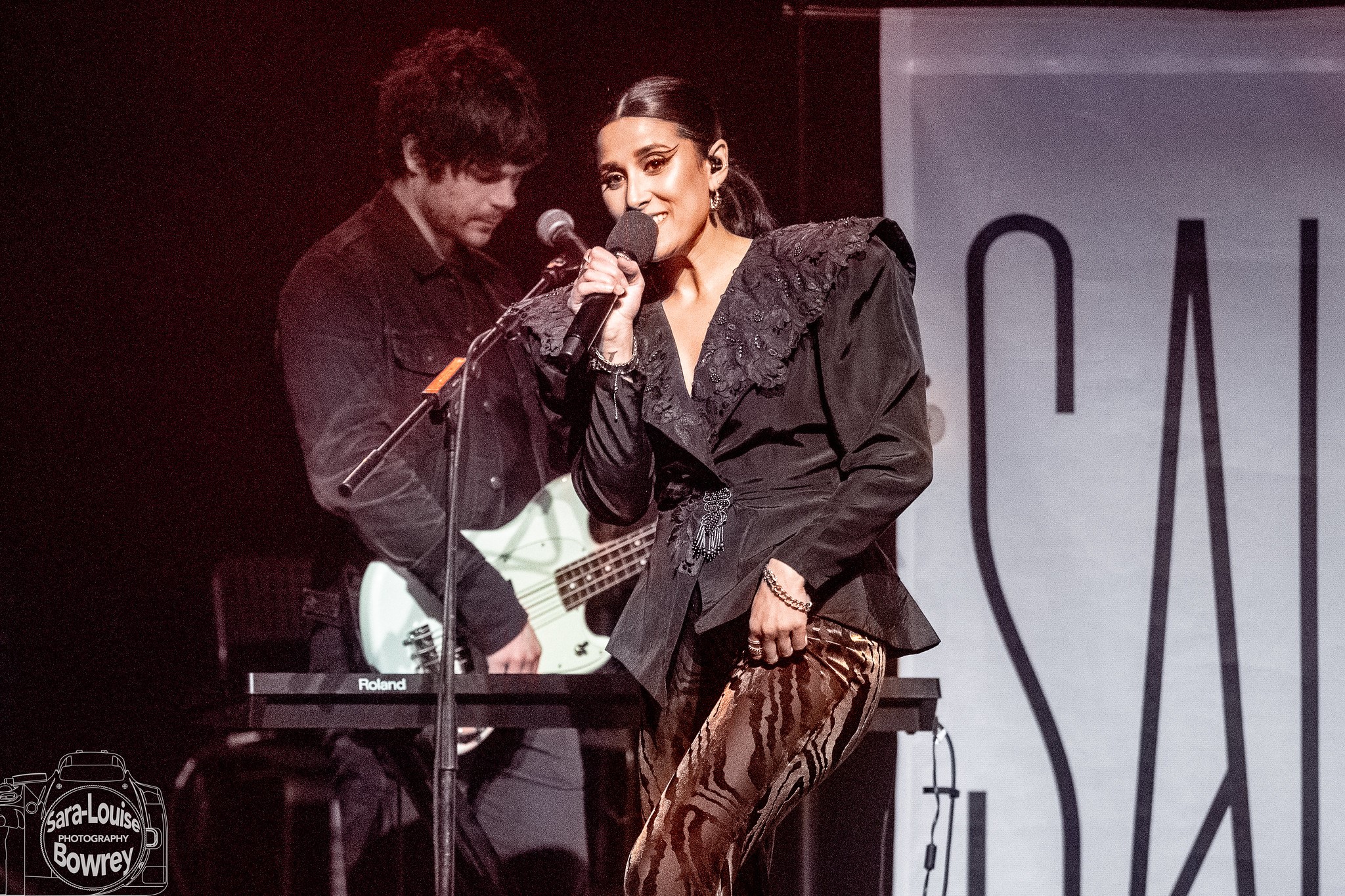 Veiga is a dynamic and engaging performer, and looks very stylish. Her outfit is a pick-and-mix of different retro fashions, with huge shoulders on a fitted black jacket, teamed with flared tiger-stripe trousers and big platform boots. She has a small Akai controller on a stand, and two microphones. Her radio mic seems to have a drier signal, with another cabled microphone that swathes her voice in chorus and long delay, or adds processed harmonies. She stalks the stage, grooving to the powerful drumming, pulling cool shapes and dropping into deep squats. I rather like the tumbling vocal melody on ‘Love Love’, and recent single ‘Body Says’ packs a powerful message about sexual politics. There’s a spare floor tom with a set of beaters, which gets energetically pounded by the singer in the number’s wonderfully dramatic climax. ‘Whatever You Want Me To Be’ is slower and moodier, though builds to a lively vocal workout.