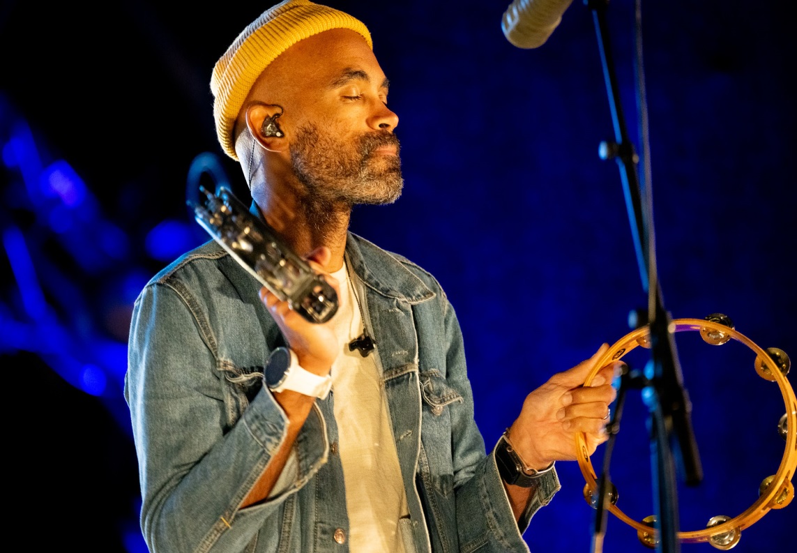 Although Fleet Foxes were tonight’s main stage headliner, that doesn’t mean that the music has stopped for the night. No indeed. Next up in The Big Top we have experimental rock band Battles. This is another band that I’ve been wanting to see for years. They were originally a four-piece, but having lost Tyondai Braxton (guitar, keyboards and vocals) in 2010, and Dave Konopka (bass, guitar, loops, effects) in 2018, they are now down to a duo. Most bands would have either called it a day, or recruited new members, but Battles simply aren’t like most bands. What happened with Battles was that Ian Williams, who up until 2018 had been responsible for guitar, keyboards and the Ableton Push (which for technophobes like me is a machine that triggers samples and does some other near magical stuff too. ‘Tis witchcraft basically) took on the additional duties of effects, bass and loops. He does all of this at once, and it is very impressive. He may have some assistance from technology though.