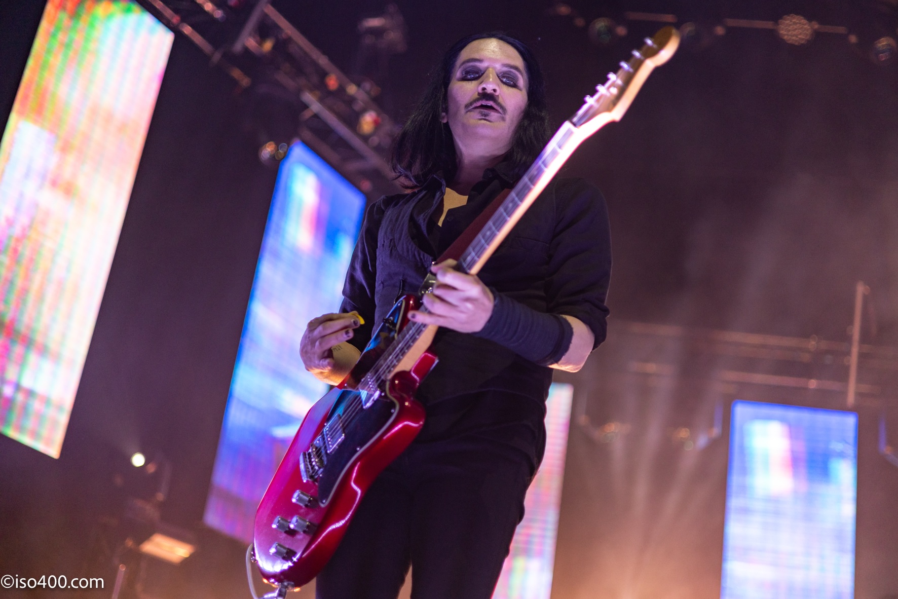 As a live unit there were six of them on stage this evening. Frontman Brian Molko was as always taking care of lead vocals as well as continually swapping his red Fender guitar with another guitar. He certainly has the look that Hugo (“Well Mr Anderson”) Weaving had as “V” in ‘V For Vendetta’ as well as an Adam Ant vibe going on. His partner in crime was the loftier Stefan Olsdal on Gibson Victory bass and latterly piano. He was sporting a Tintin haircut which made him look even taller. They were backed by four musicians who were introduced but I didn’t catch all of the names, but I strongly suspect they were; stage right (our left) Angela Chan on keyboards, violin and backing vocals; to her left was Matt Lunn on drums and percussion; and then came Nick Gavrilovic on guitar; and finally Bill Lloyd on guitar, bass and keyboards.