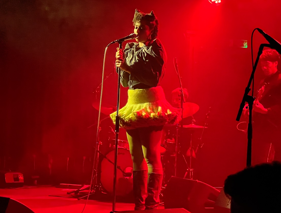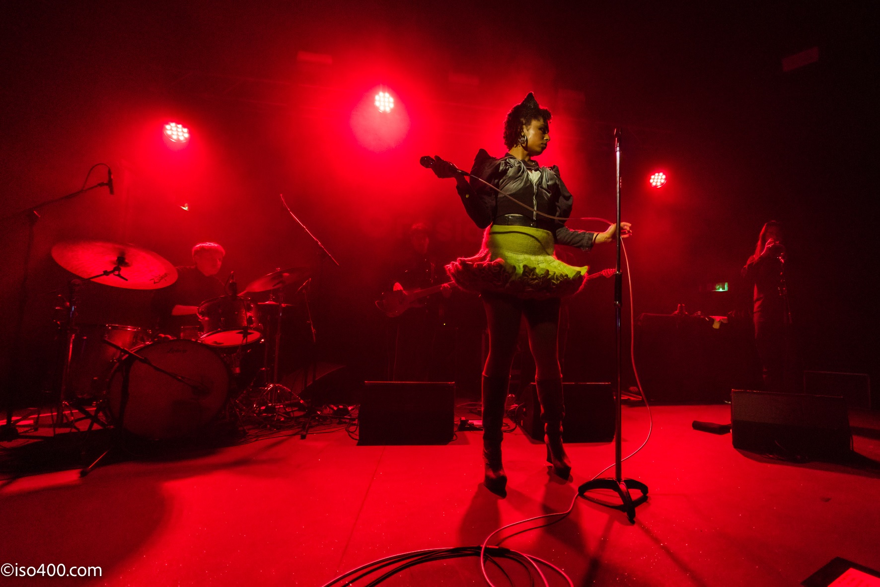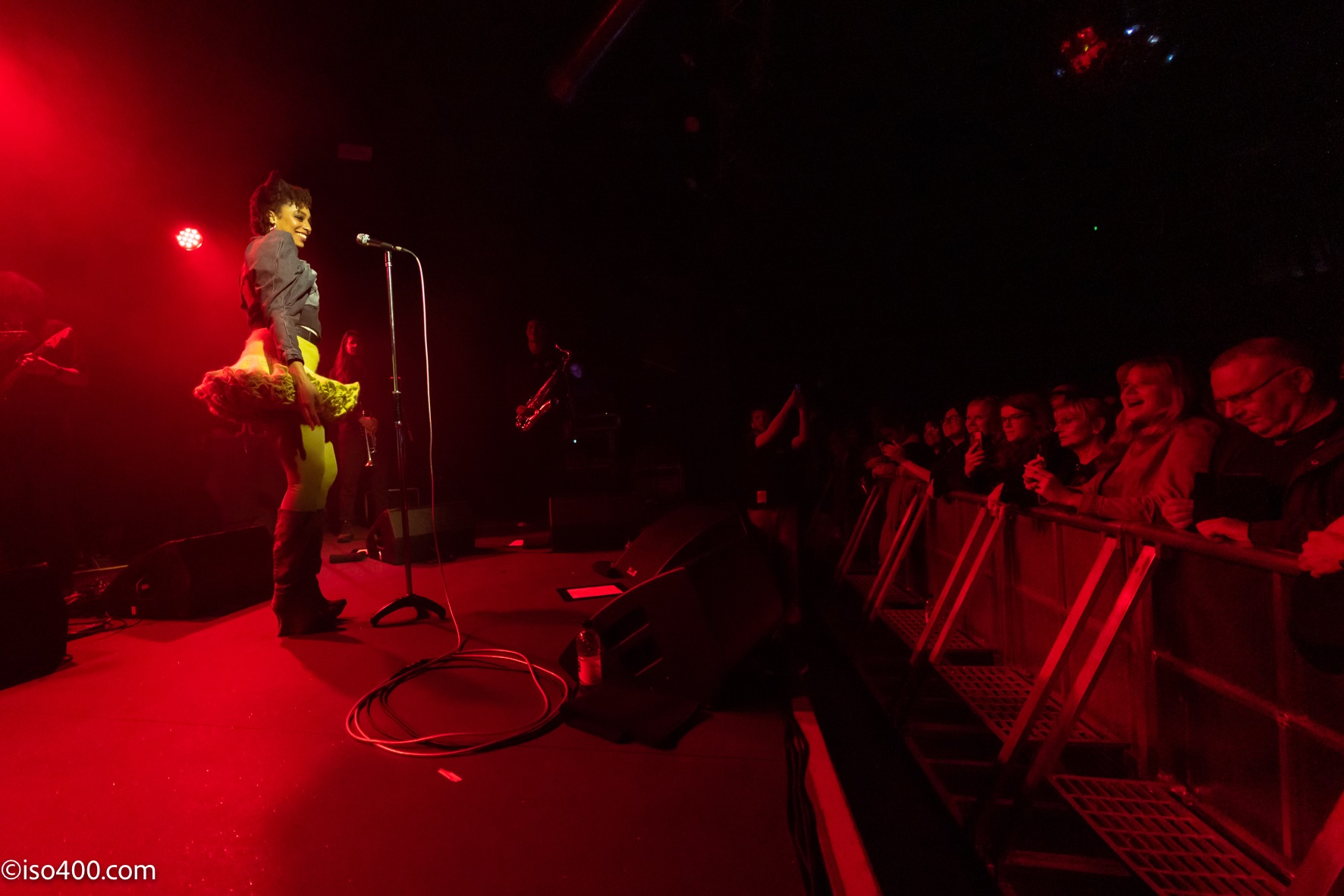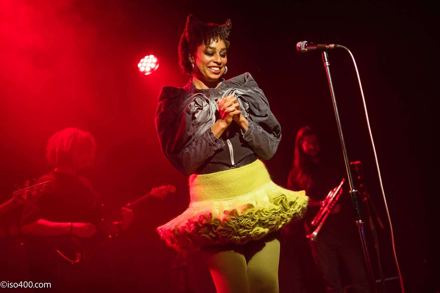 There was eager anticipation throughout the crowd who’d had plenty of time to get their drinks in and there was a rapturous greeting when Celeste finally arrived on stage just after 8:45pm sporting a striking ensemble of punky horns in her hair, black ruffled top and a wide-brimmed lime green ruffled skirt and knee-length boots which were removed after three songs to allow her to move more comfortably. Celeste thanked us for our patience and was clearly delighted to finally perform in Brighton again.