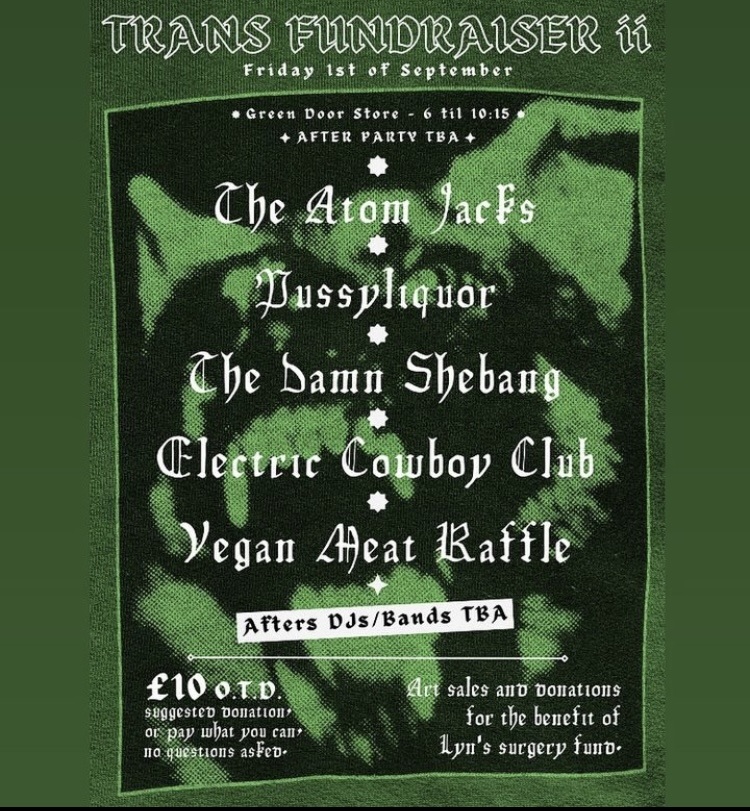 The evening is going under the banner of ‘Lyn’s Trans Fundraiser ii’ and will feature live music sets from local legends The Atom Jacks, Pussyliquor, The Damn Shebang, Electric Cowboy Club and Vegan Meat Raffle. There are no advance ticket sales for this event, only a suggested £10 donation (or pay what you can) on the door. With such a quality lineup, it would be wise to get down there nice and early. Those wishing to attend must be 18+.