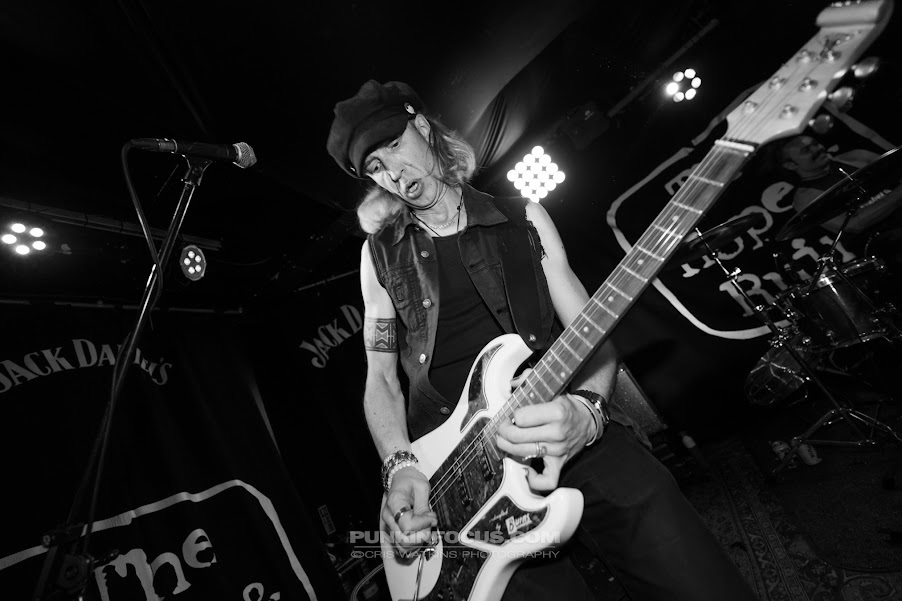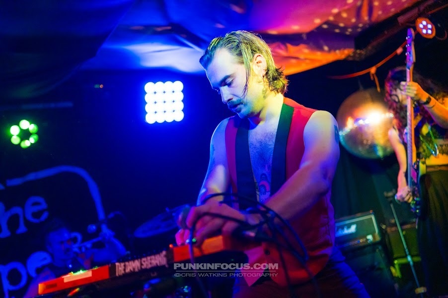The Damn Shebang who bill themselves as “Brighton’s premiere evil R’n’R band”. Tonight, the quartet of Dead Seany (vocals/keys), JJ Symon (guitar/backing vocals), Lyn Gasper (bass) and Dan Brown (drums) whizzed through no less than eight tunes in their 25 minute set. This wasn’t our first encounter with the band, whose name is stylized to ‘The Dmn Shbng’ as they formed here in town (Brighton) back in 2015.