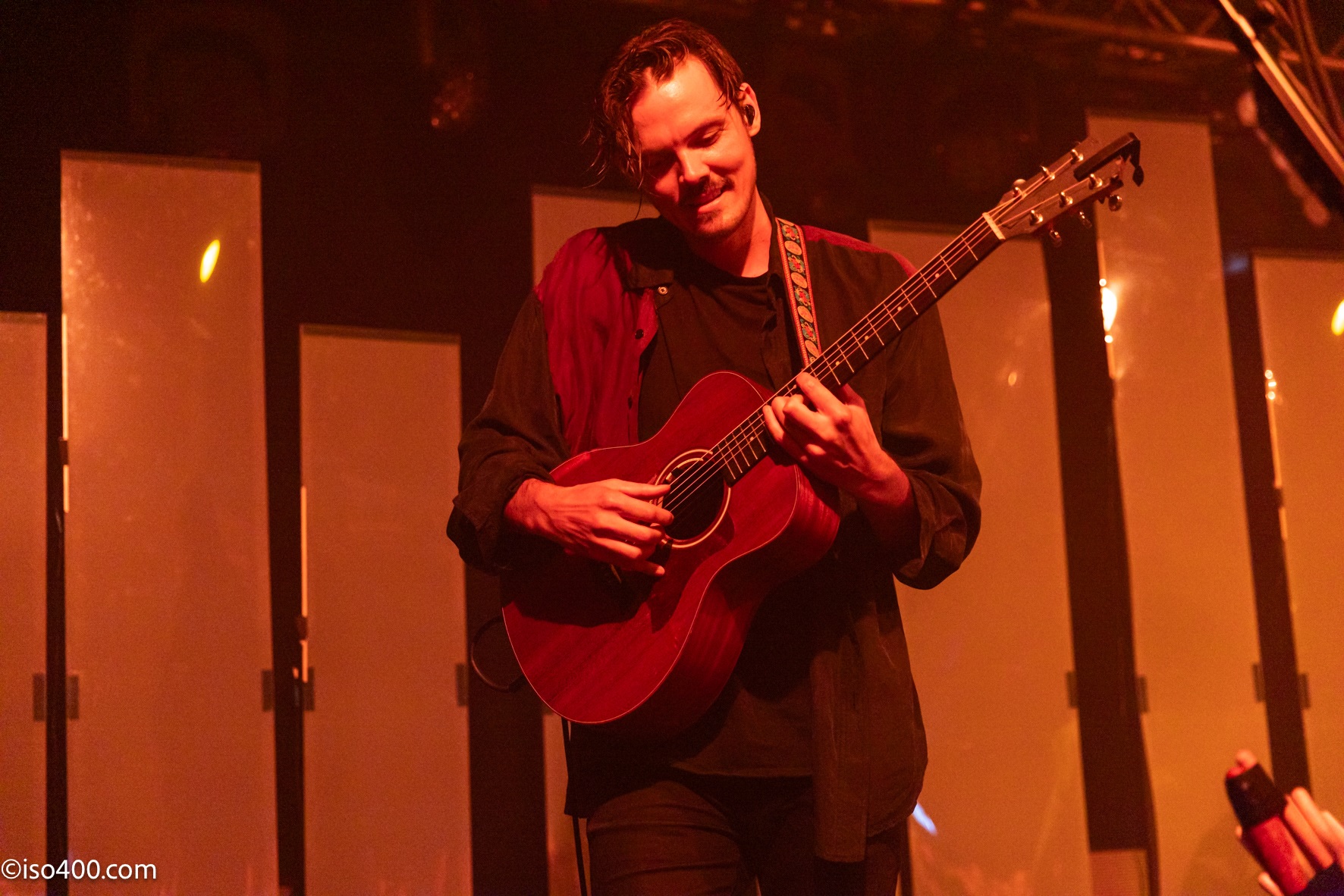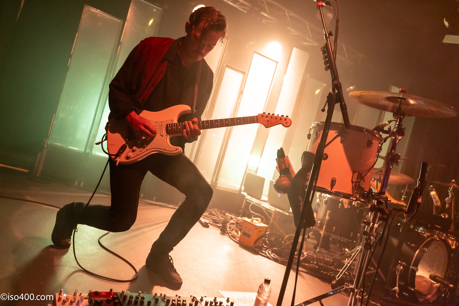The room has become very full, and there’s a buzz of anticipation in advance of the headliners’ arrival, not least from a Canadian friend I’ve randomly met down at the front. The stylish but understated stage set has a screen of white oblong panels giving a retro feel somewhere between art deco and 1960s op-art. There’s an extensive array of guitars standing ready either side of the stage, with a tom drum on a stand at Devon’s position house left, and a stack of keyboards for Conner, house right. Dylan has a keyboard set up where the rack toms would usually be on the drum kit, and there’s another side on, next to the hi-hat.