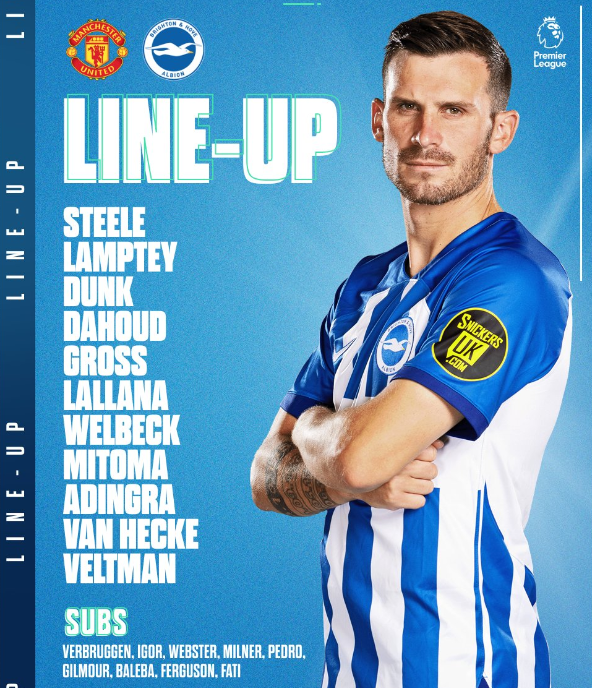 Roberto De Zerbi has made several changes including restoring Jason Steele in goal and recalling the fit again Danny Welbeck and Adam Lallana. Simon Adringa also starts.