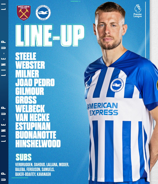 Adam Webster returns to the starting line up as Igor Julio joins the Seagulls’ injury list. James Milner is also due to start.