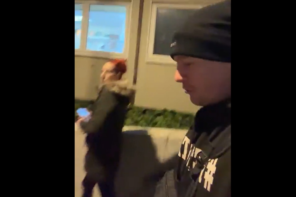 The video was streamed live last night on Facebook by an account called Mr Airborne and features a man wearing black clothing and hat and a woman with red hair who he calls Becks.