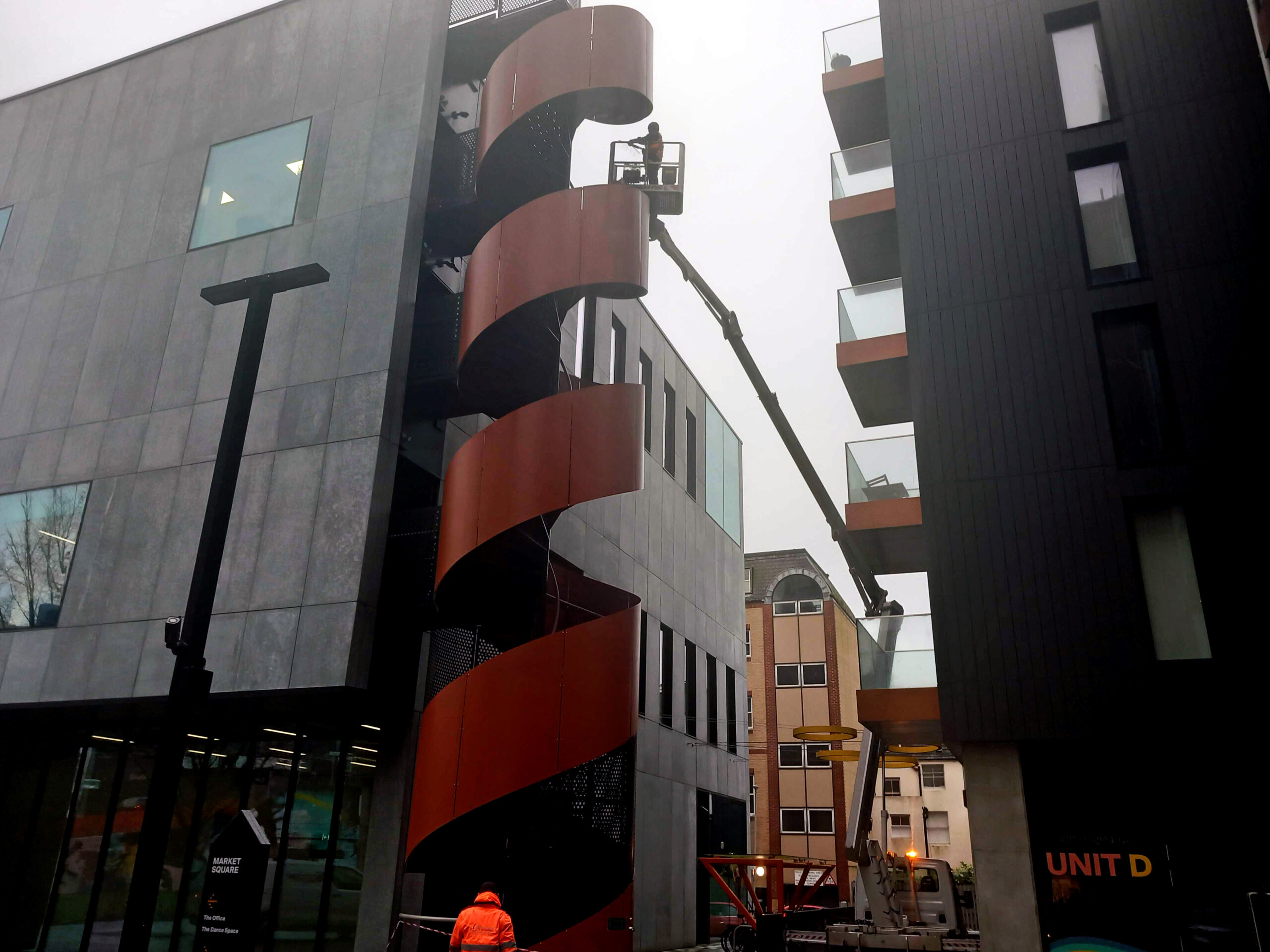 Workers were spotted today putting up spikes on the orange staircase adjoining The Dance Space in Market Street.