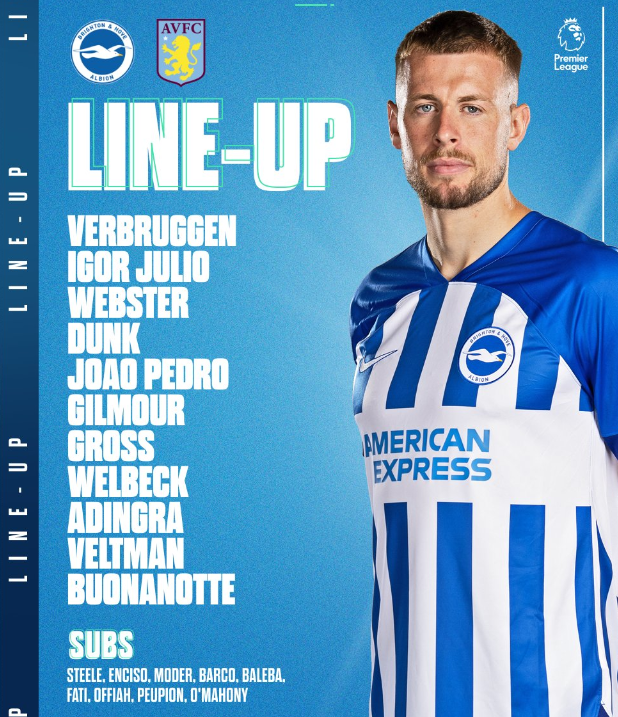 Brighton and Hove Albion take on Aston Villa at the Amex with Bart Verbruggen back in goal and Adam Webster making a rare start.