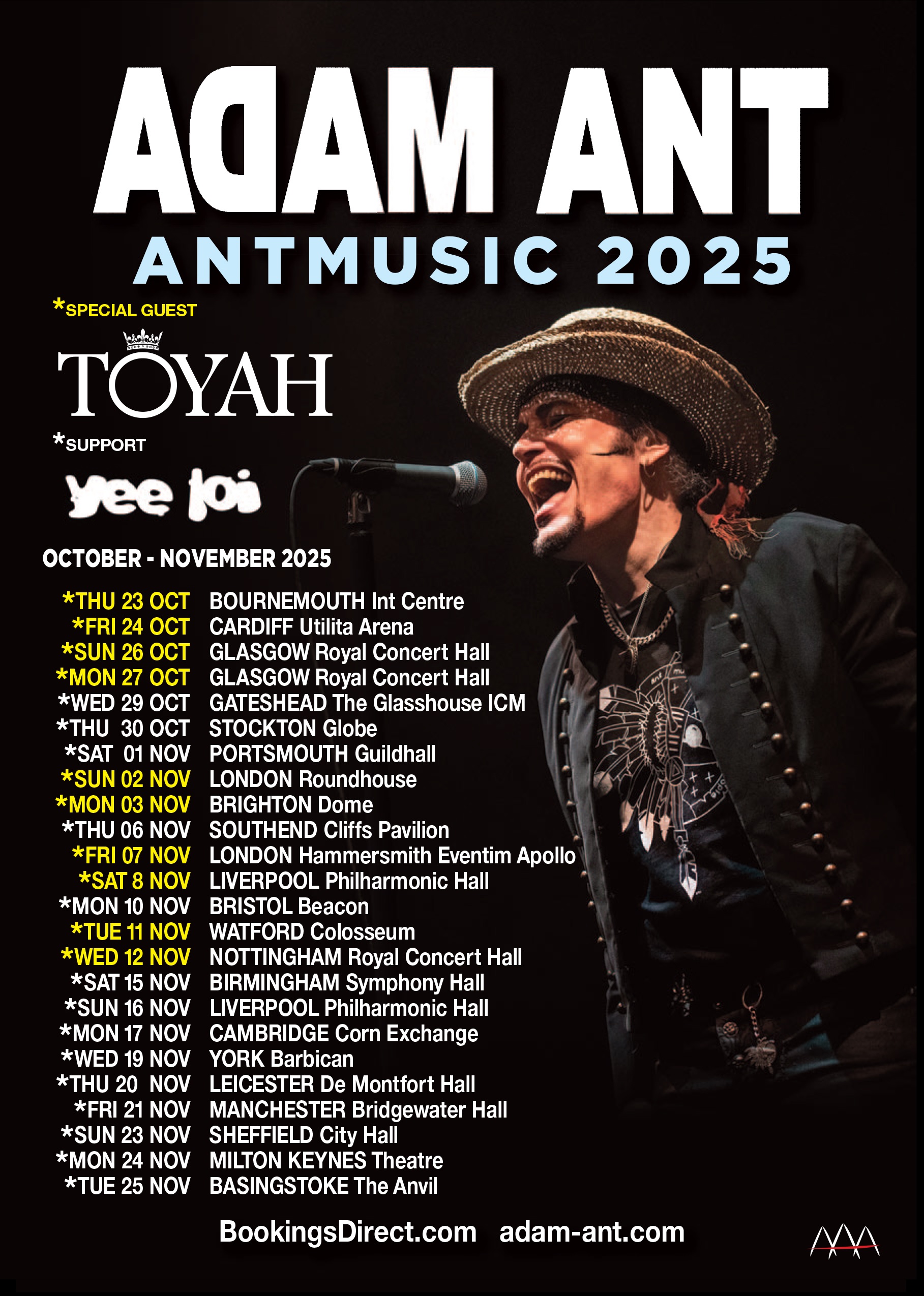 Iconic pop sensation and Grammy nominee Adam Ant has rescheduled his highly anticipated ‘Antmusic Tour’, now set to take place across the UK in autumn 2025. Originally planned for 2024, the new tour dates are confirmed, and fans can look forward to an electrifying line-up of live performances, beginning on 23 October 2025 in Bournemouth, with extra shows added across the UK.
