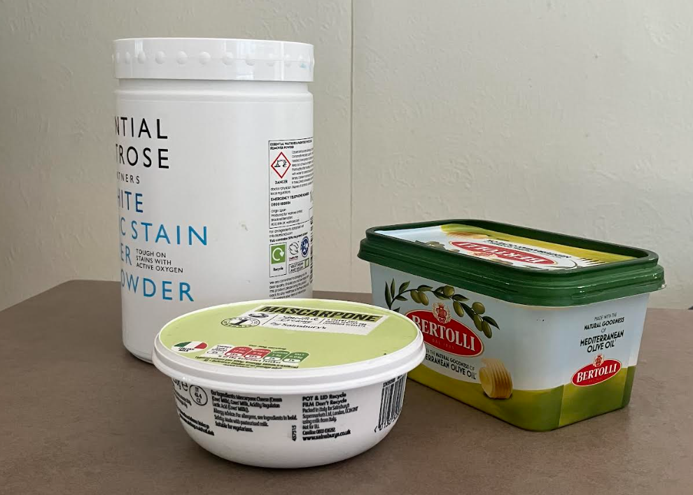• plastic tubs that contained margarine, chocolate, pasta sauces, ice cream, baked goods, such as bite-sized flapjacks, and laundry powder