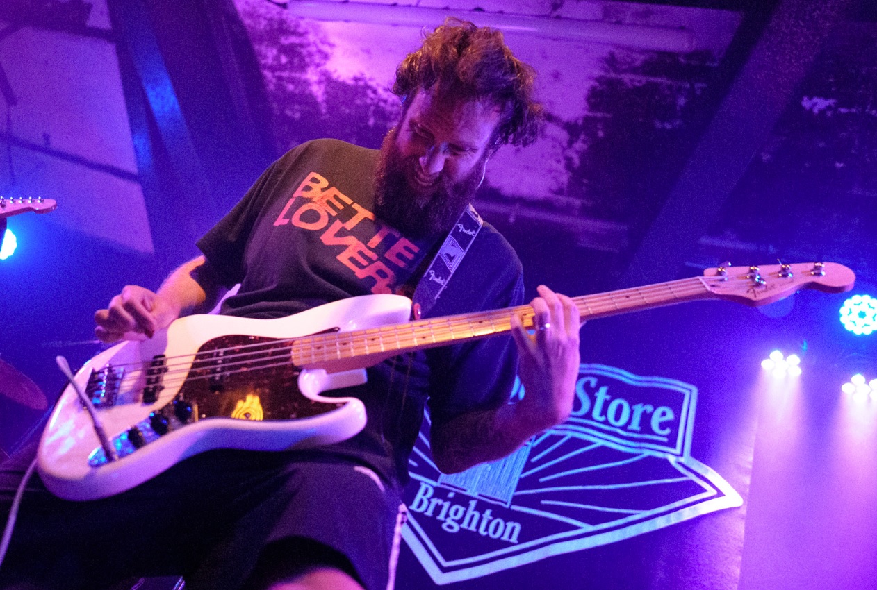 The 5-piece begin with a slow intro and then pre-recorded female vocals ring out saying “I always wished I knew someone like that”, which is followed by Ben on the drums and the quintet merrily bounced away as they played ‘Your Last Breath’, the first from 2024’s ‘I Leave You This’ album. There’s a pleasant keyboard riff going on here. Their most animated musician is Stevie on cordless bass guitar and he makes his first of several forays into the crowd and almost took my block off with the neck of his instrument. I’m going to have to keep a close eye on him as I make my notes on my phone during this performance. Three-quarters into the number we finally get the first vocals of the whole evening, which are delivered in a spoken-word style with increasing urgency until the track concludes. Yes friends, the two opening acts both offer up instrumental numbers. This number builds and builds and their statement of intent has been announced!.