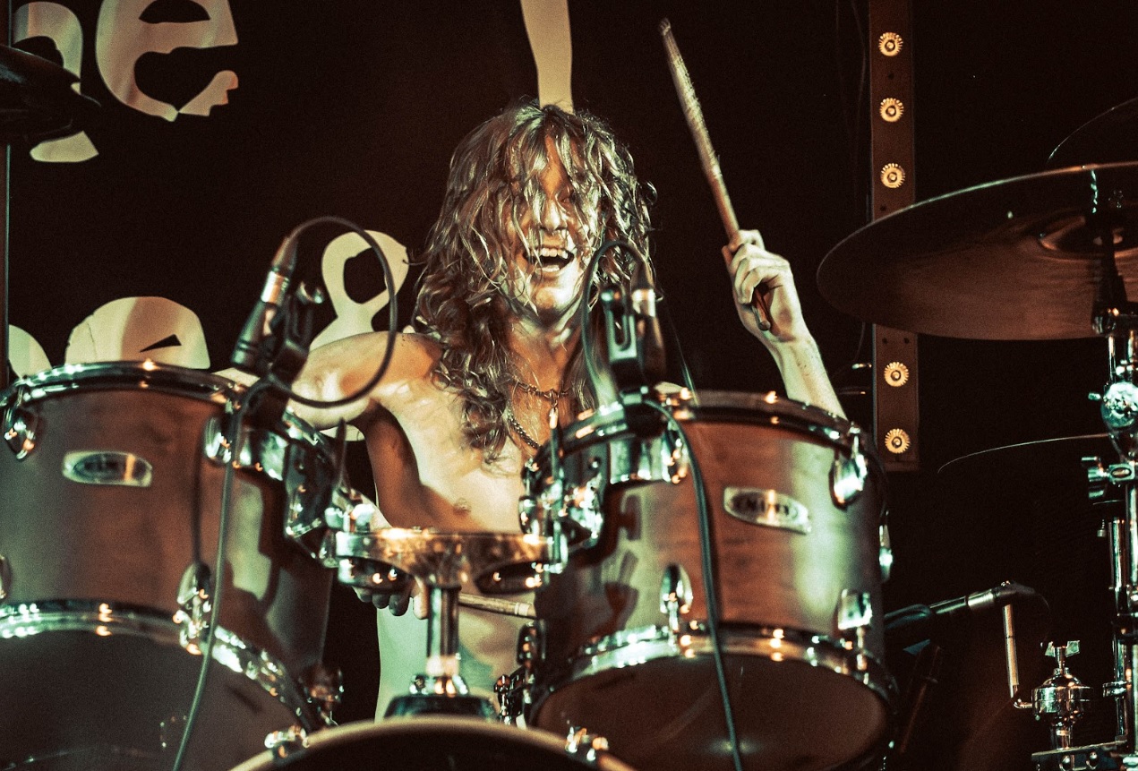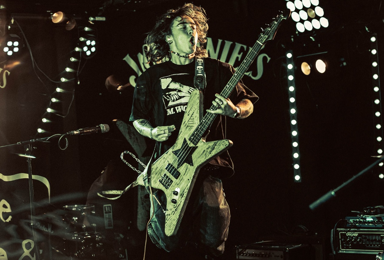 The lads are very tight this evening as they lead into the EP title track which has a 70’s TV theme vibe at the beginning. Arthur’s vocals and screams are truly guttural and the punters cannot fail to notice them. But just in case they do, then Herbie briefly vacates his drumkit and jumps off the stage with a blue cowbell in hand and wanders in amongst the crowd whilst playing it, whilst his chums deliver the musical feedback. ‘Don’t Leave Me Now’ came next and there was a photo opportunity mid-tune as Arthur stood on top of one of the speakers and then launched himself and bass off of it.