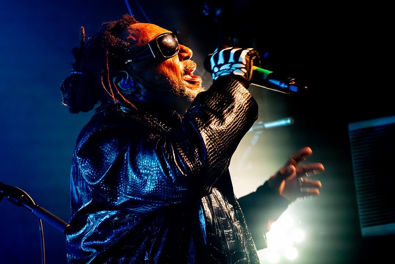 At 9:12pm the lights went fully out on stage, and AC/DC’s ‘Thunderstruck’ was played with white strobe type lighting and beams shining around, this built up for the full 3 and half minutes, before the band came on stage one by one at 9:15pm to a souped up beaty version of ‘Darth Vader’s Theme’ from ‘Star Wars’. I noticed the band were only 3 in number tonight, Benji Webbe on lead vocals, synthesizers, wearing a long black leather looking trench coat, wrap around black shades adorned with silver spikes and his famous dreadlocks tied up. Mikey Demus is on guitars and backing vocals, dressed in a black suit, black Trilby hat and black shades, cutting quite the look with his ZZ Top style long beard, and finally Arya Goggin on drums, his drums were adorned with flowers and a picture of Roger Moore over his bass drum. Normally the band have a bass player who could not be with them this evening.