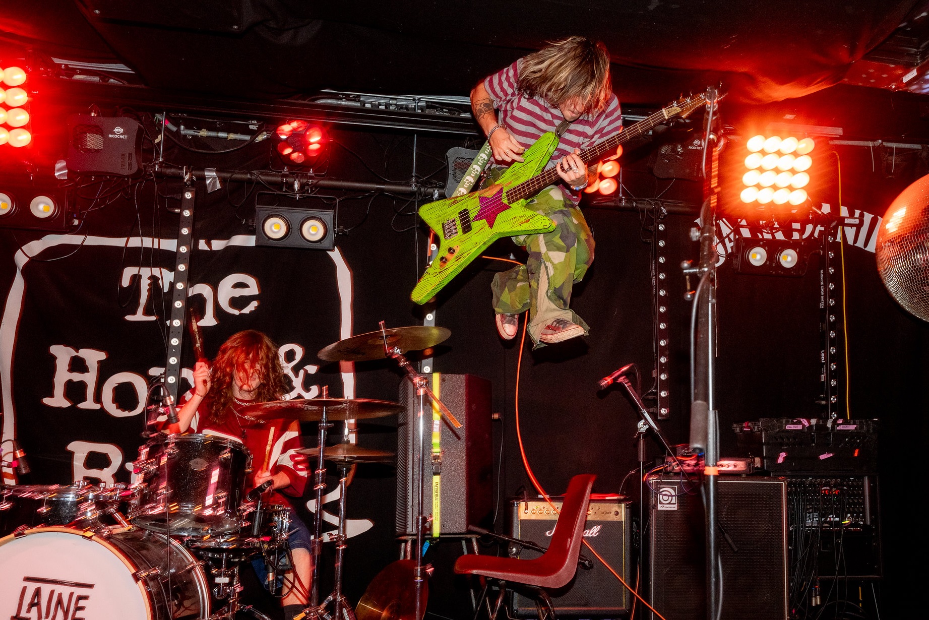 They start their set with an unreleased grunge track, ‘Soda’. This features shared vocals from Arthur and Sonny. During the catchy second song, ‘Just Bananas’, Arthur leaps from a chair that has been placed next to the drum kit. Their debut single, ‘Asbestos’, is next, then Arthur asks, “How’s it going? We are Bones Ate Arfa. We are going to play you a new song, and we’re going to dedicate it to Wing! It’s called ‘Not All Wings Are For Flying’.” This goes down well with the audience, which includes some Hidden Herd regulars.