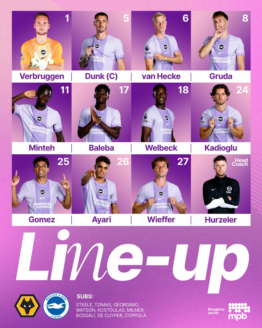 Mats Wieffer comes into the defence in place of Joel Veltman alongside skipper Lewis Dunk, Jan Paul van Hecke and Ferdi Kadioglu. Bart Verbruggen is in goal.