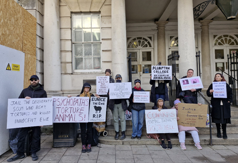 They gathered outside Lewes Crown Court “demanding justice for the horrific acts of torture and abuse inflicted on a sheep in November 2023 by two former students from Plumpton College”.