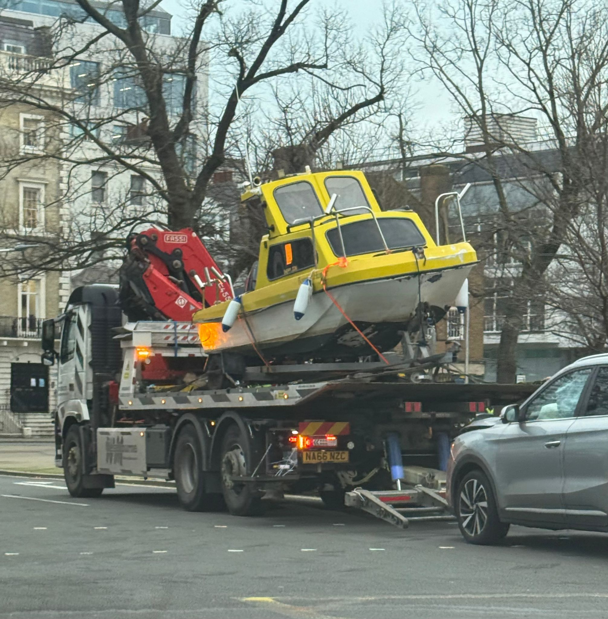 A boat got caught up in a crash which closed a busy Brighton road yesterday.