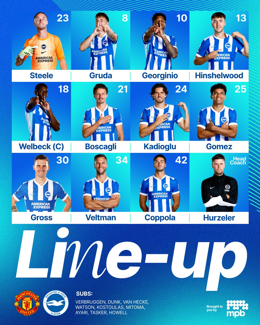 The five who started against City who are down for a start today are Pascal Gross, Ferdi Kadioglu, Georginio Rutter, Diego Gomez and Jack Hinshelwood. Joel Veltman also starts.