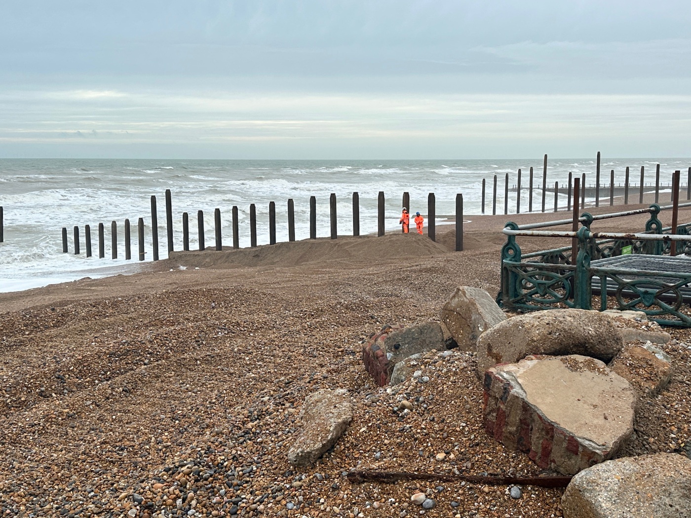 Timber posts have been driven into the shingle to support the groynes, which will be filled with tonnes of shingle.